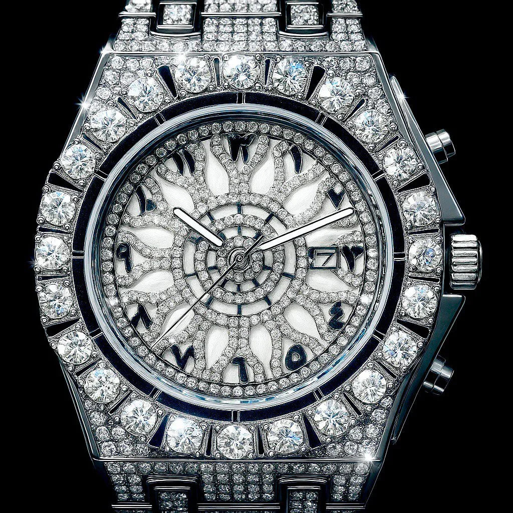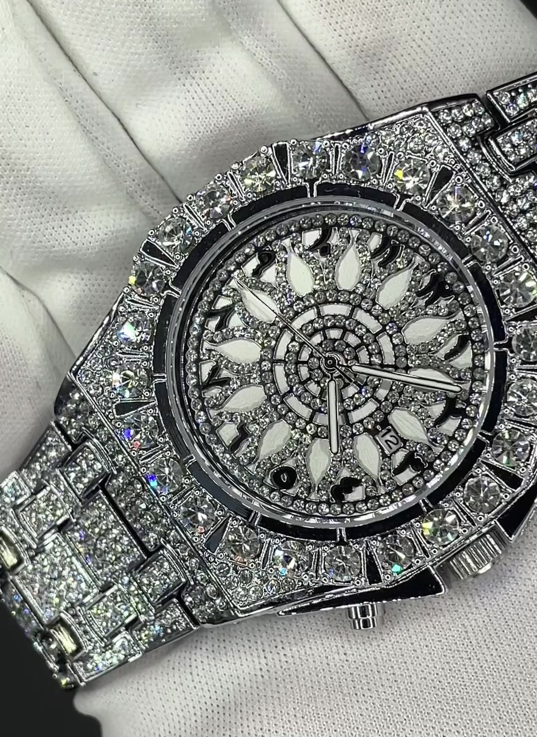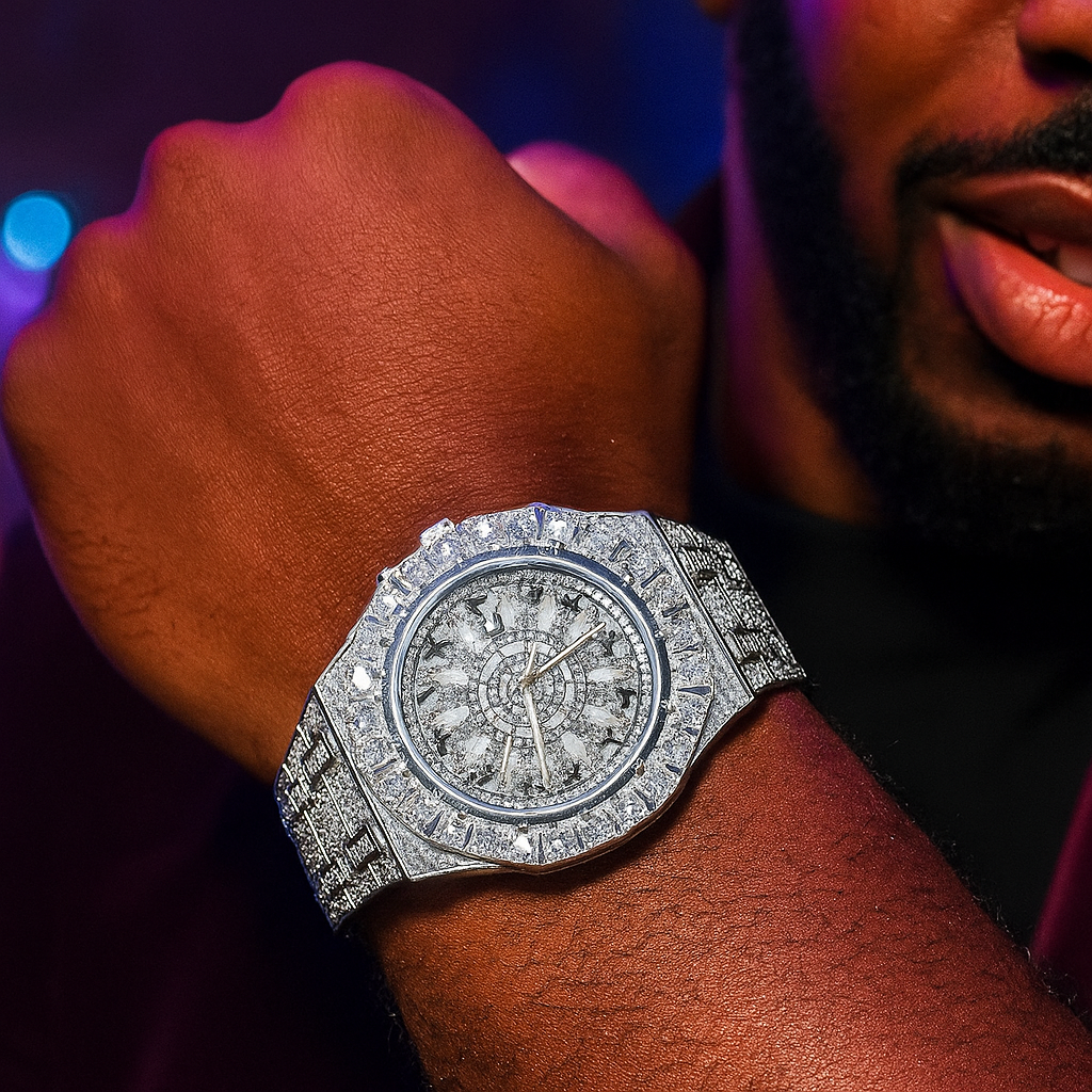 Turn heads with this round dial watch, iced out in shimmering stones for the ultimate hip-hop look. Designed for bold individuals who love flashy style, this watch combines streetwear energy with elegance.