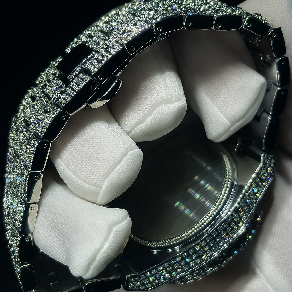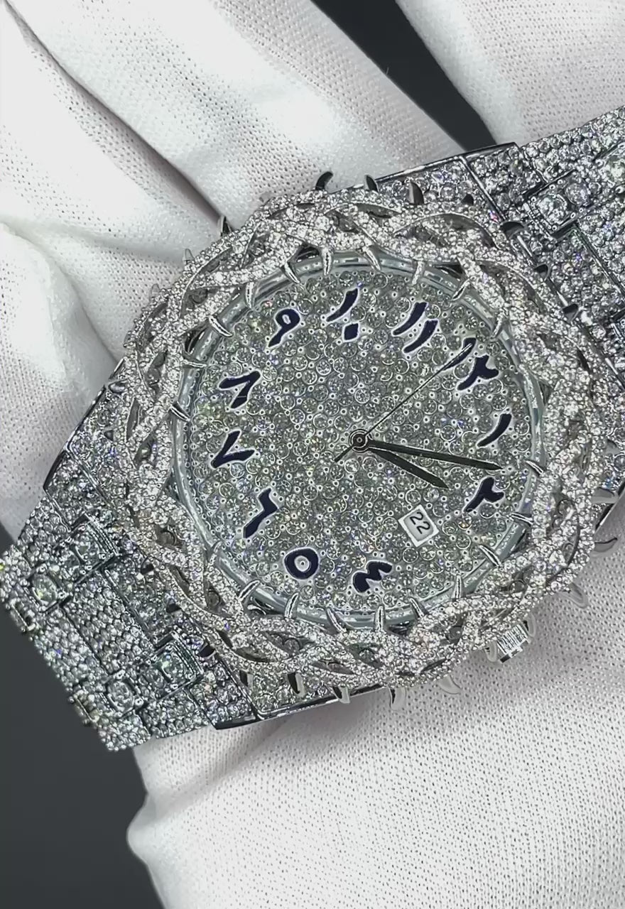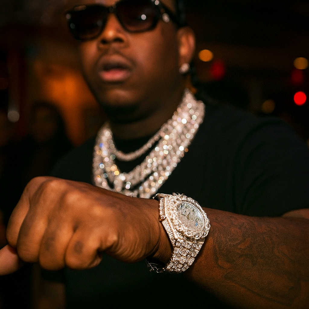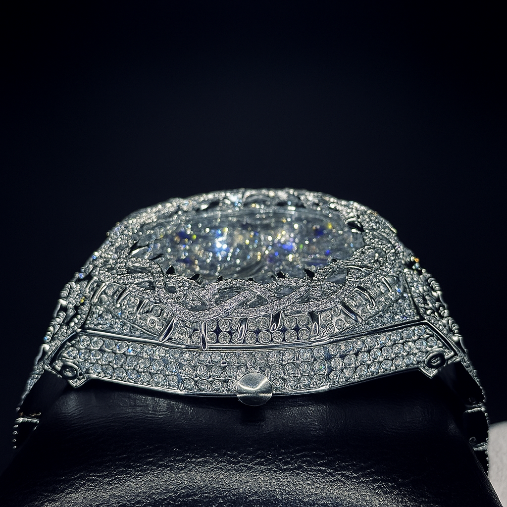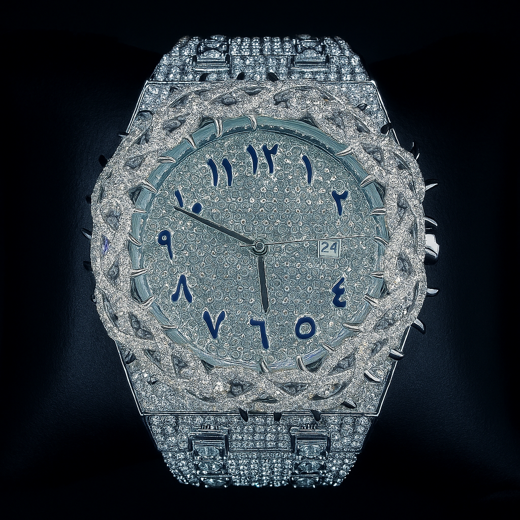 Command attention with this opulent iced-out square watch — a true statement piece for kings of style. Fully encrusted with our signature LuxGlow™ stones, its radiant brilliance is matched only by the bold Arabic numerals shimmering over the diamond-dusted dial. Designed for those who live loud and shine brighter than the crowd.